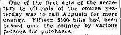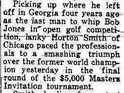 The first Masters was a rudimentary affair compared to today's professional production with its worldwide live media coverage and sold-out crowds proudly holding one of the toughest tickets in all sports. Prize money in the heart of the Depression was far more modest than today's seven-figure purses and first-place checks. The first playing featured a total purse of $5,000, $1,500 of which went to winner Horton Smith. The March 26 edition of the Chronicle featured extensive coverage: