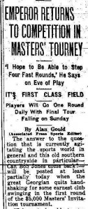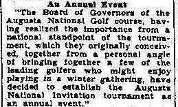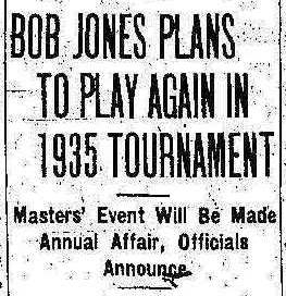 The Masters, world famous as one of golf's major championships, has been played since 1934. Conceived by Jones, the annual event was intended to bring the top professional and amateur players together in the spring when the Augusta National course would be at its best. Originally called the "Augusta National Invitational Tournament,” the hometown Chronicle began referring to it as the "Masters' Invitation Tournament." By 1939 this was shortened to the Masters, a name known today by even the most casual sports fans. At first the Masters’ primary draw was less the prospect of seeing out-of-town competitors than watching the great Bobby Jones in action once again. Jones had entered no important tournaments since his post-Grand Slam retirement in 1930, but was still in the public eye thanks to a series of instructional films made in Hollywood as well as golf equipment endorsements which he had accepted after retiring from amateur competition. While Jones intended the tournament to be a gathering of old friends and top-level players, his other aspirations were publicity and recognition for his new club and the resulting prestige that would come from hosting such an event. Though he was firmly retired there was much speculation about how Bobby would do in his dual roles of host and competitive golfer. Speaking to reporters on the eve of play, Bobby said, "I hope to step four fast rounds," but sportswriters knew that his putting was not thought to be tournament-ready.