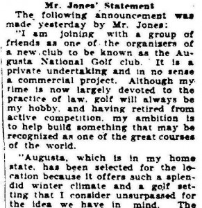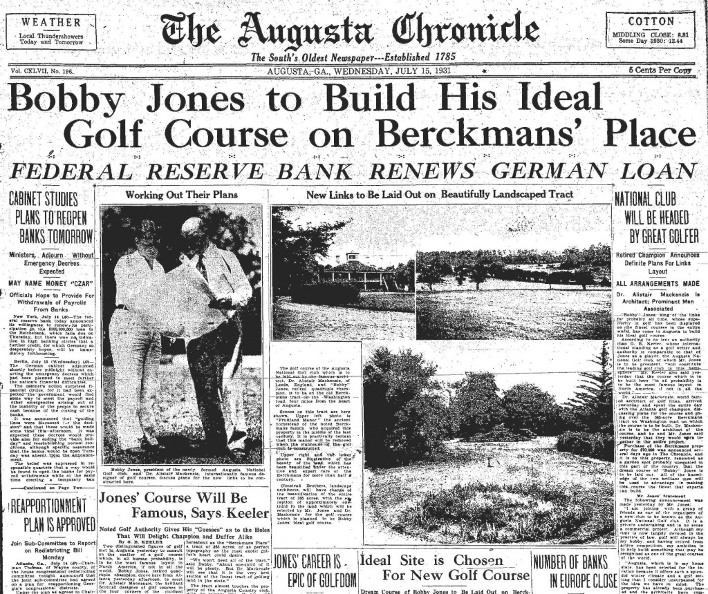 For a one-dimensional athlete, retirement from his or her chosen sport can be a challenge greater than any faced on the fields of competition. Jones, however, was a well-educated, intelligent soul interested in much more than the game of golf. Not only had he earned undergraduate degrees from Georgia Tech (B.S., Mechanical Engineering) and Harvard College (B.A., English Literature), but after just one year of law school at Emory he passed the Georgia bar exam. Jones looked forward to embracing the rewards of a well-rounded life. Determined to remain part of the golf world, Jones sought to establish a club with members from across the nation. It was to be situated in a climate warm enough for winter play. Members were to be successful men who took their golf seriously and had the financial standing necessary to form the type of club that Bobby envisioned. On July 15, 1931, The Augusta Chronicle devoted most of its front page to coverage of the announcement that Jones and his associates were founding the Augusta National Golf Club. Nearly six of its eight columns were necessary to display four articles on Jones and his new club.