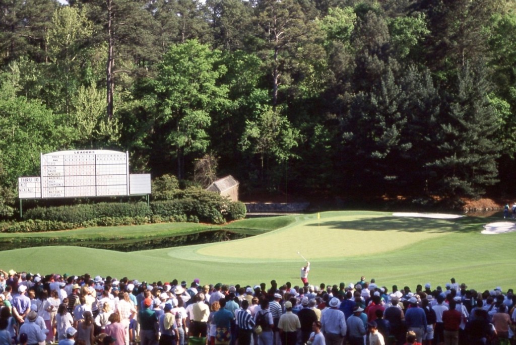 This view of the 1990 Masters shows the gallery watching play on the 12th tee with the 11th green in the background. (Copyright: Larry Petrillo)